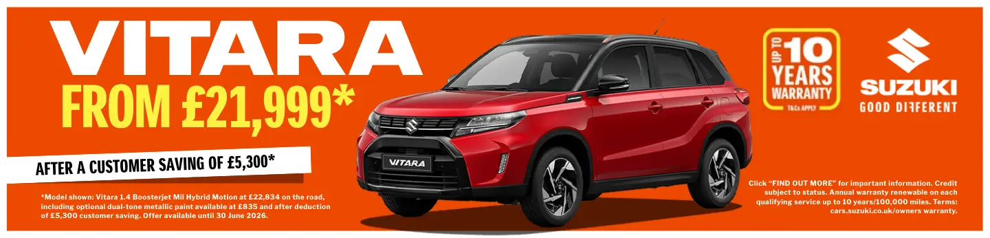 Vitara blends authentic SUV style and capabilities with a compact, lightweight design, delivering dynamic driving, without compromising on efficiency. For added confidence on challenging terrain, optional ALLGRIP SELECT 4WD* has got you covered. And with hybrid tech, advanced safety and a suite of driver assistance features as standard, it’s no wonder owners are keen to keep Vitara their little secret.